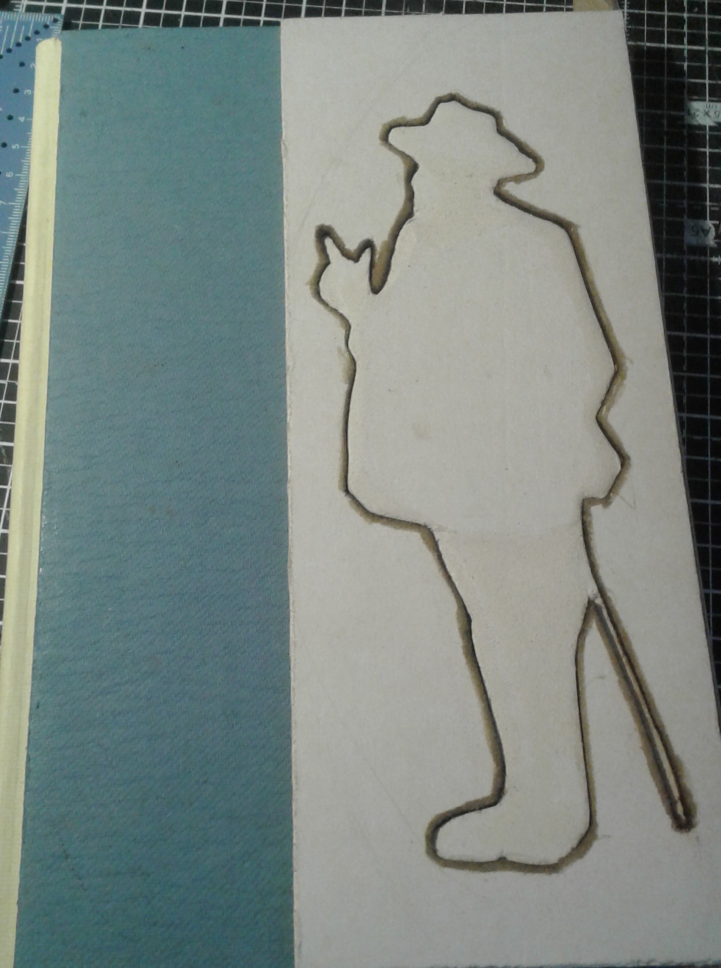 Le problème : mes talents en dessins sont « modestes », pour ne pas dire médiocres. Il me fallait donc penser à un moyen simple et stylisé d’évoquer ce trait sans en trahir la qualité. Je décidai de ne garder que la silhouette, décalquée puis recoupée en plusieurs épaisseurs dans du carton afin qu’il apparaisse en relief sur ma couverture.