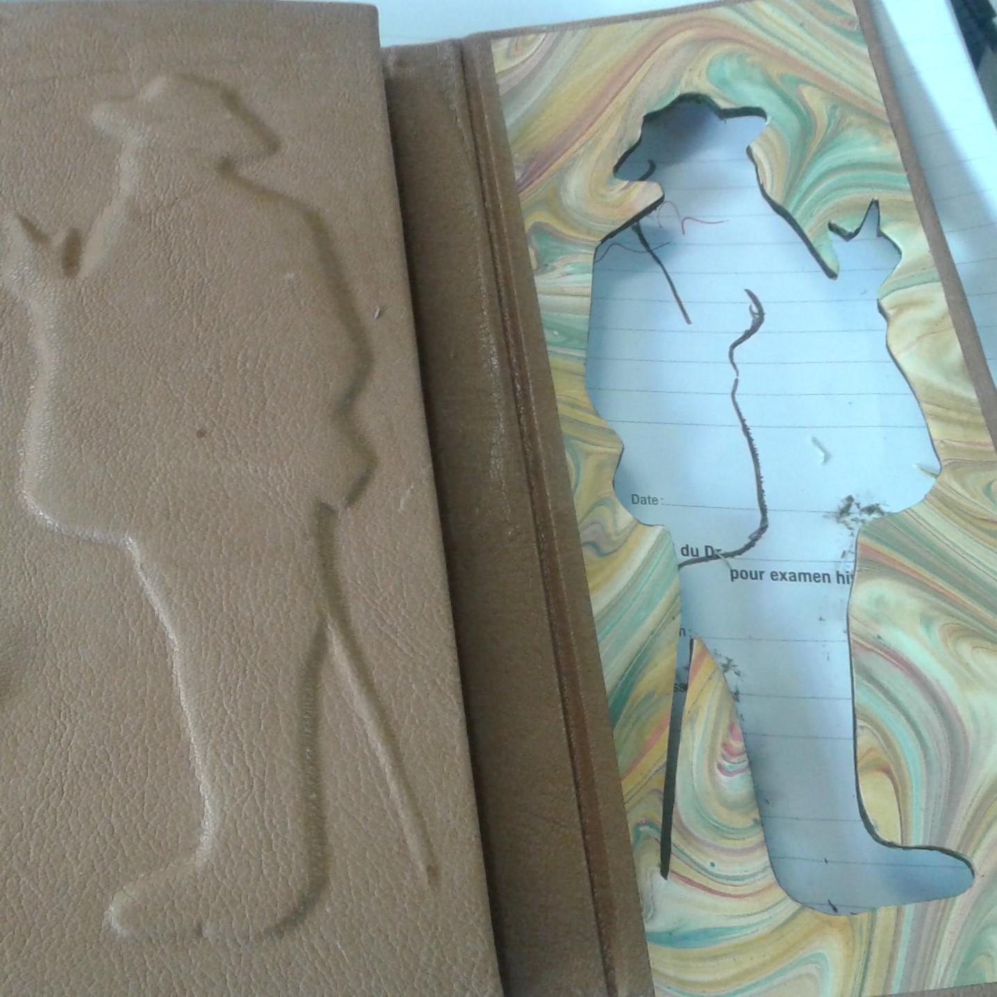 Une fois les silhouettes réalisées, j’ai recouvert les plats d’un plein cuir brun. J’ai choisi cette couleur à la fois pour rappeler les teintes du livre initial mais aussi pour conserver quelque chose qui se veut simple en apparence. Sobriété atténuée – comme une caricature dissimulée – par cette silhouette qui semble à la fois sévère et bonhomme.