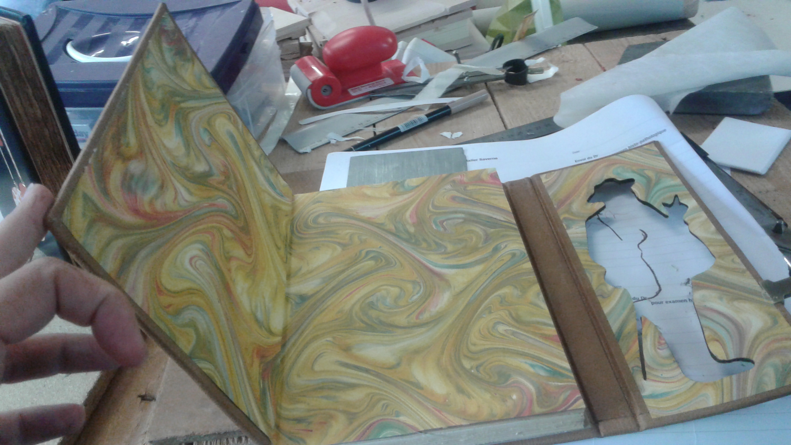 Découper au scalpel une même silhouette dans plusieurs épaisseurs (carton, cartonnette, papier de garde, cuir) a été un travail à la fois minutieux et de longue haleine… Sans compter les erreurs de « débutant » : découper la silhouette dans le mauvais sens (!) ou utiliser le papier dans le mauvais sens. En effet, si vous ne le savez pas, le papier a un sens d’allongement et lorsqu’il est mouillé il peut prendre jusqu’à 2 mm … par conséquent, sur une découpe extrêmement précise, ces deux millimètres m’ont obligée à tout recommencer!