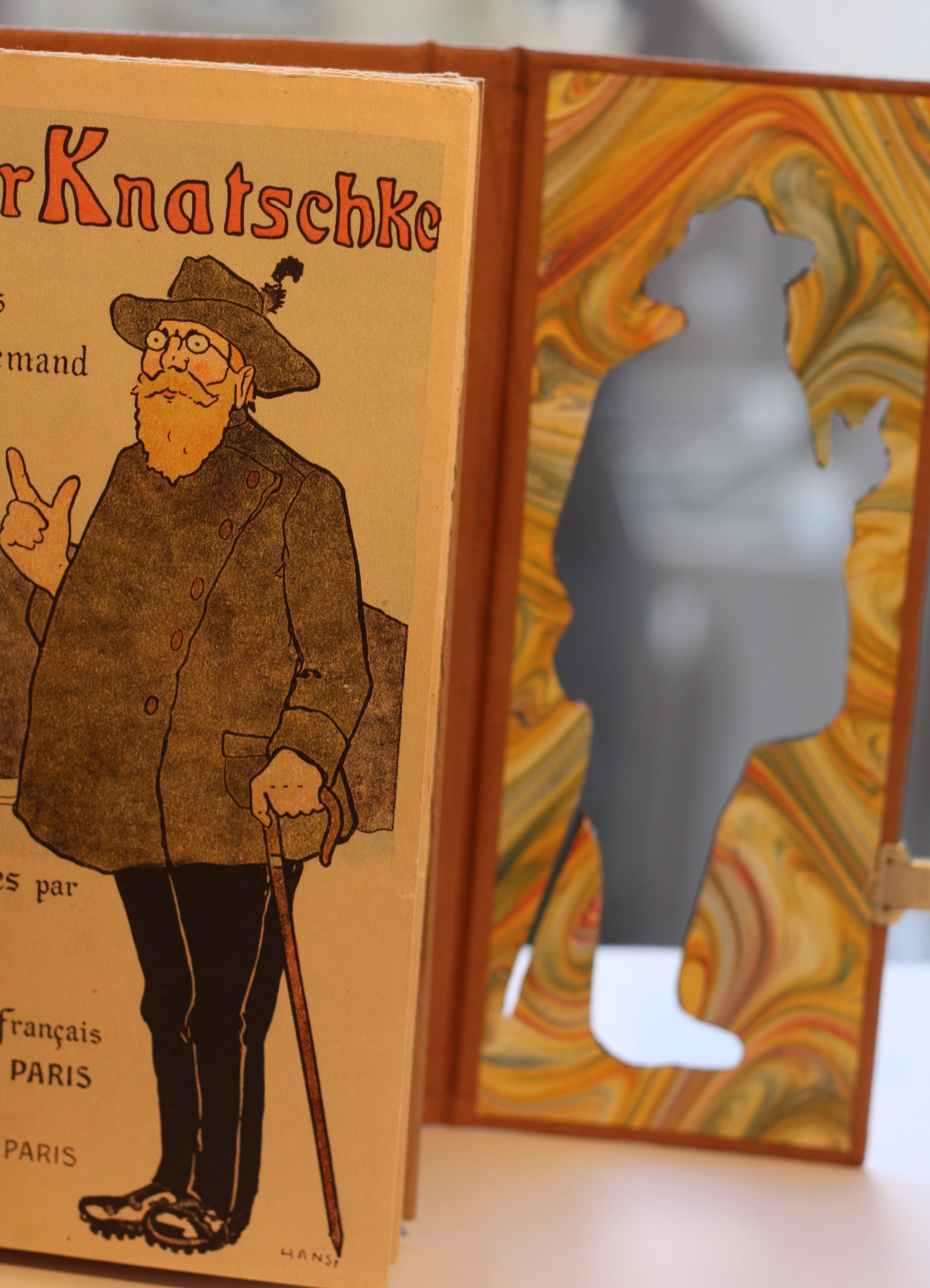 Après avoir trouvé l’œuvre sur laquelle je souhaitais travailler, et restauré quelques pages abimées par le temps, l’idée de reprendre les lignes principales de la couverture initiale sur ma reliure m’a semblé une évidence. Ce bonhomme rondouillard et presque caricatural dont les traits évoquent immédiatement le style de Hansi.