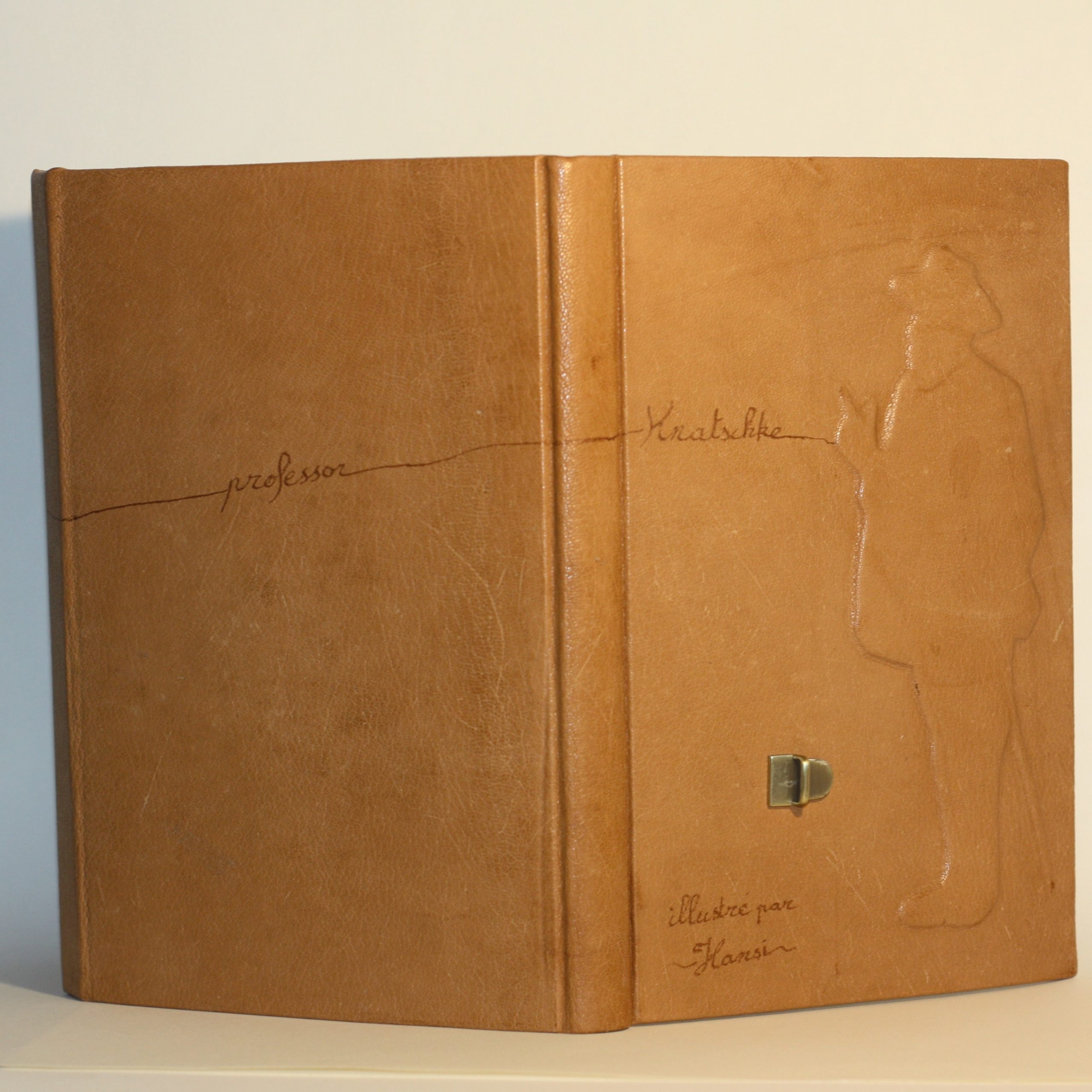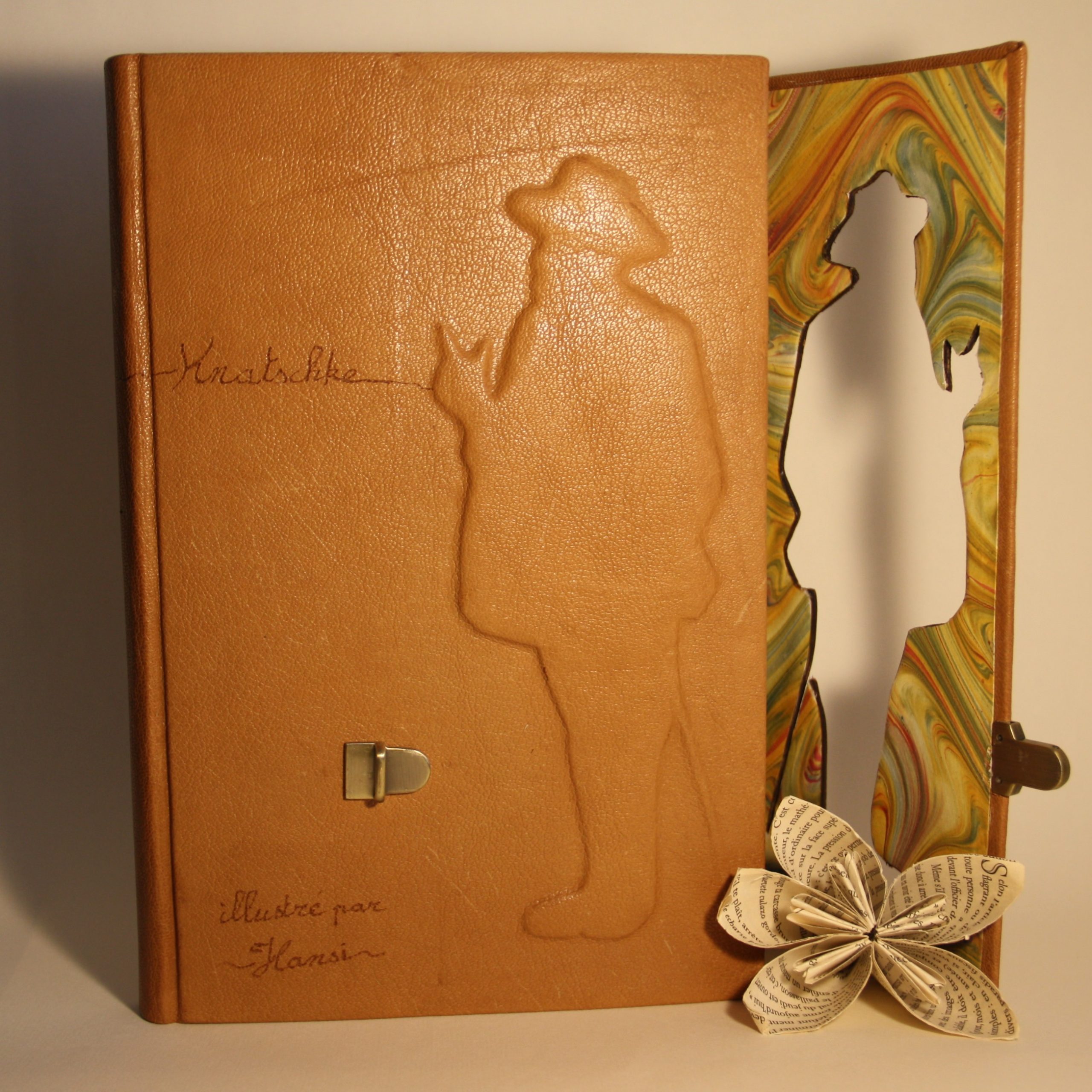 Cette reliure d’une édition illustrée par Hansi publiée en 1931 a été réalisée dans le cadre de l’exposition « autour du papier et du patrimoine » de Wissembourg en 2017. Nous étions invité, par l’association Libr’Odysseae à présenter nos reliures de création. Il s’agit de la première vraie création que j’ai réalisé après avoir passé mon CAP en juin 2017.